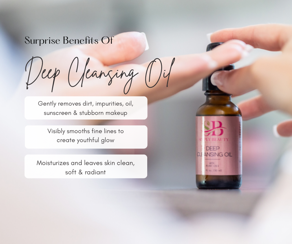 - Gently massage over dry face & eyes to break down, makeup, debris, and oil on face
